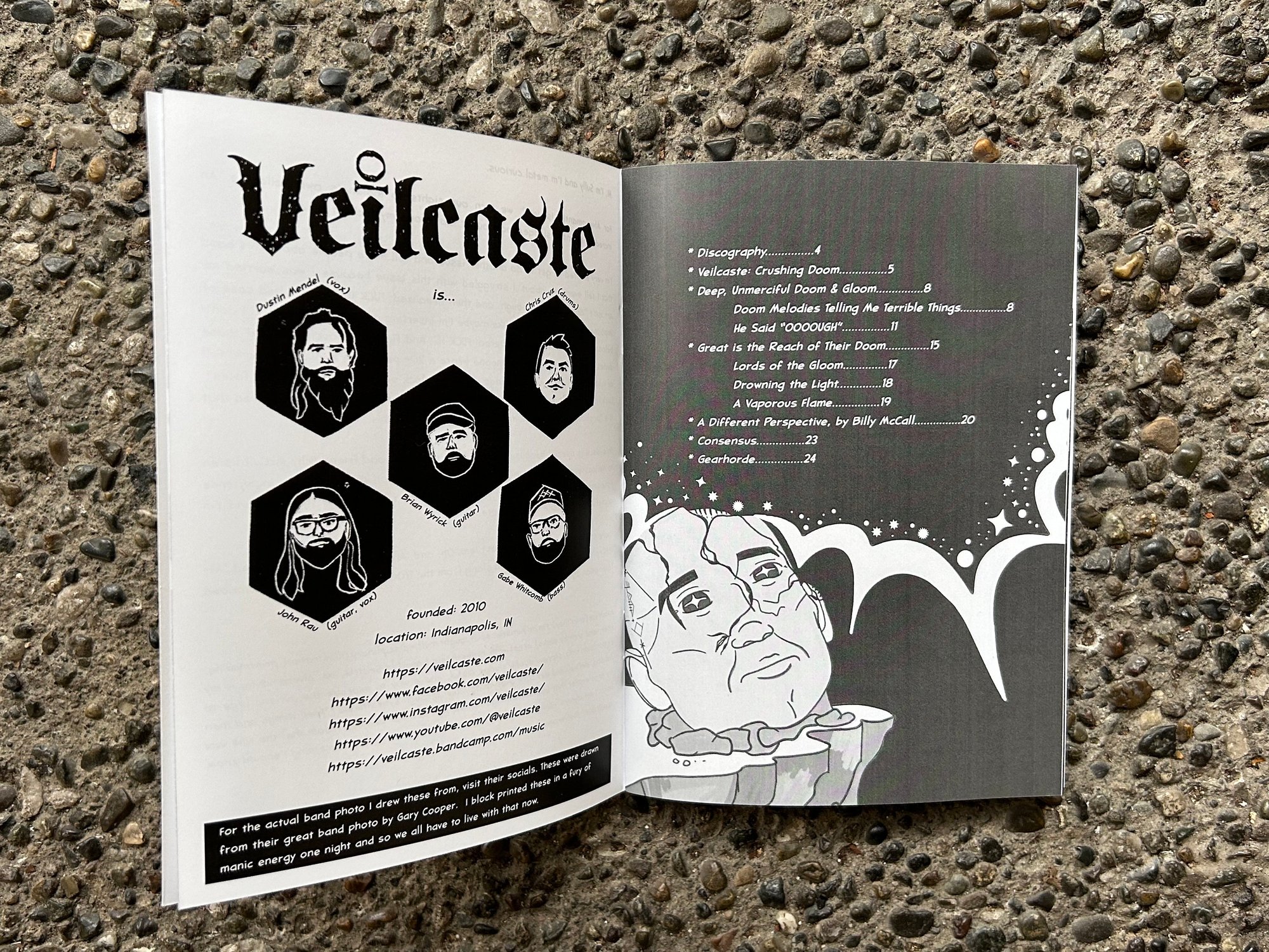 Founded in 2010, Veilcaste’s music has a mix of sci-fi themes, differentiating them from the standard fare of wizard doom metal. This zine contains 24 pages of “review and analysis” of their tone, the themes in their songs, and a poem by HP Lovecraft!