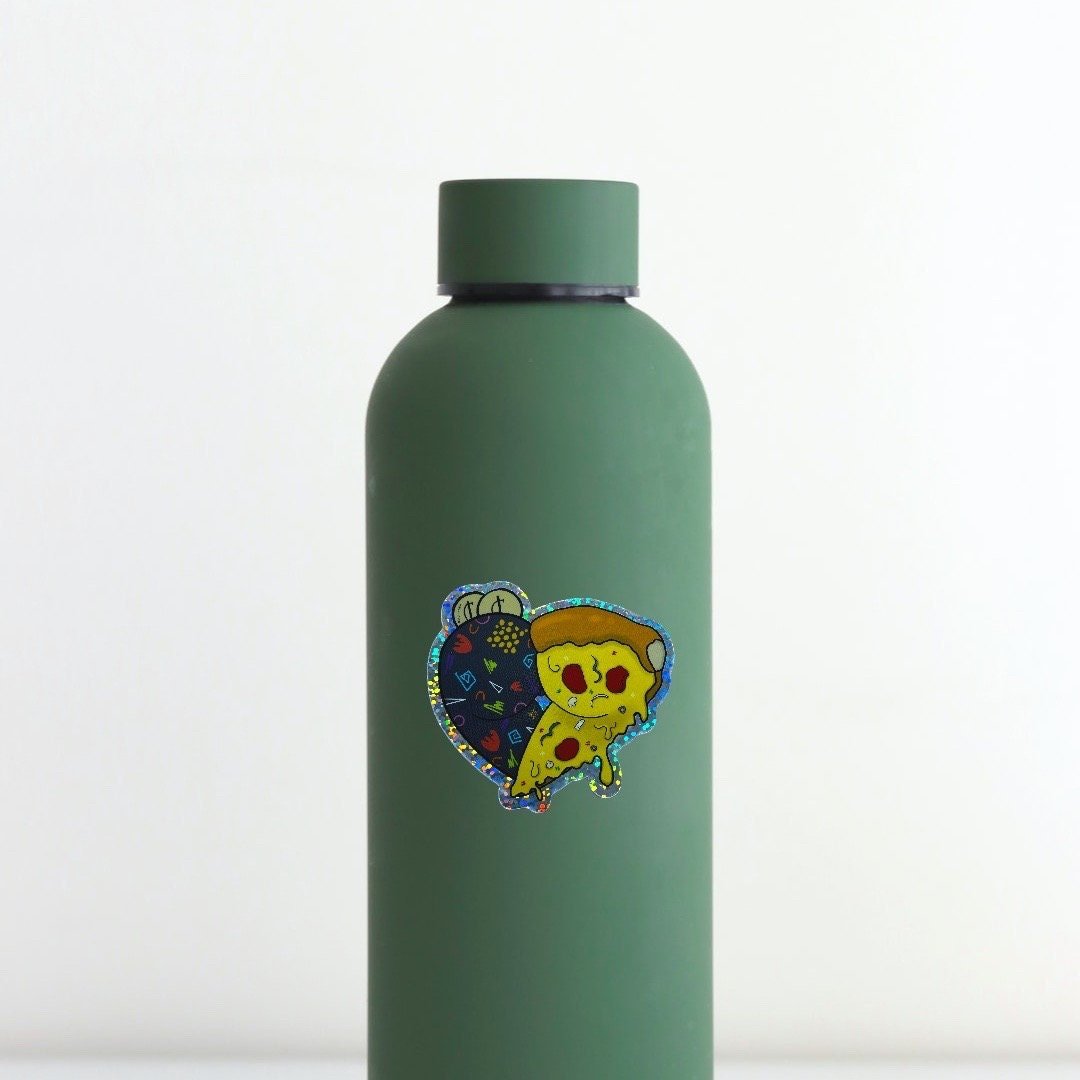 Remember the joy of an arcade pizza party? Relive the nostalgia with this glitter vinyl sticker featuring a slice of pizza, a bit of retro arcade rug, and few precious tokens!
