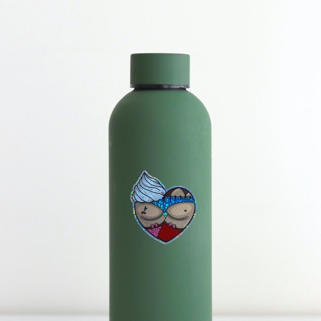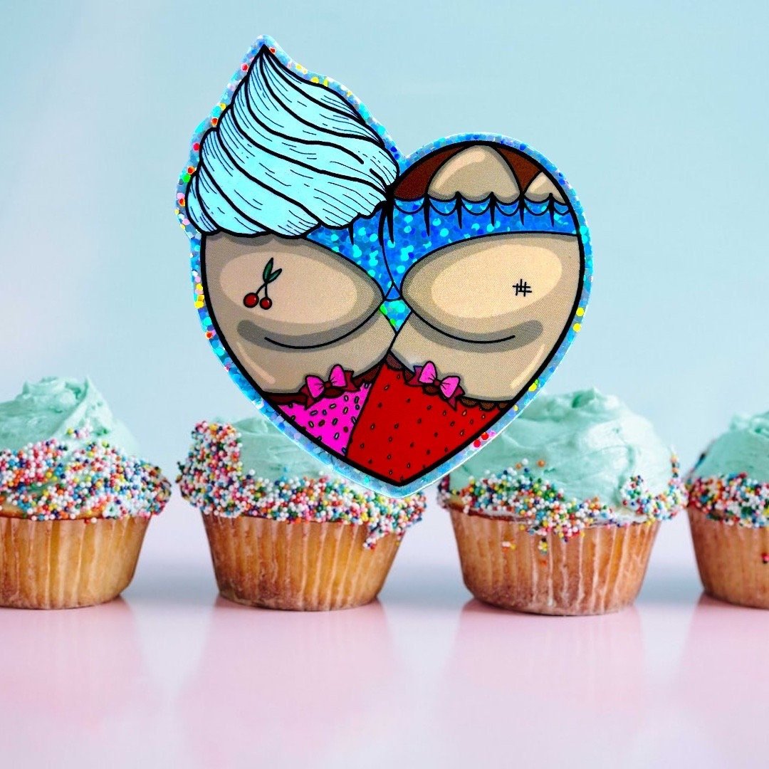 This sweet treat booty heart sticker measures approx 2.5x2.3” and is printed on glitter vinyl material.